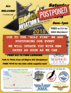 Model Aviation Day Postponed this weekend at OCMAThis entry was posted in Uncategorized on August 9, 2018 by mikegreenshields Due to the Holy Jim Canyon fired, OCMA’s Model Aviation Day is Postponed and the field is closed. Check back to Flyocma.com for details. Let’s all think good thoughts for all the people worried about their homes and evacuated. Share this:Tweet Related